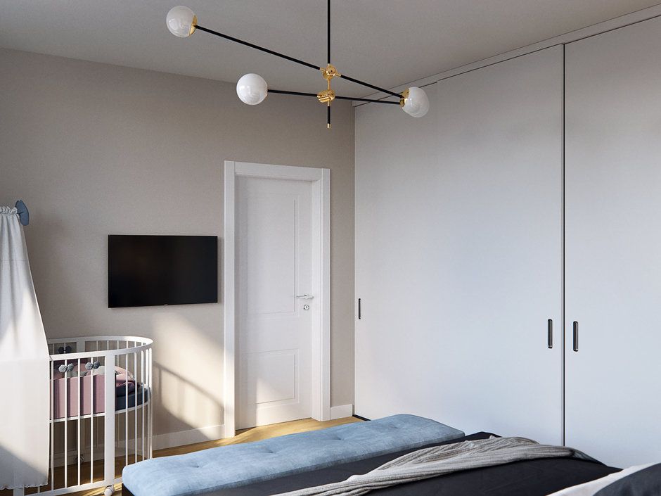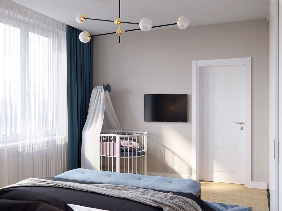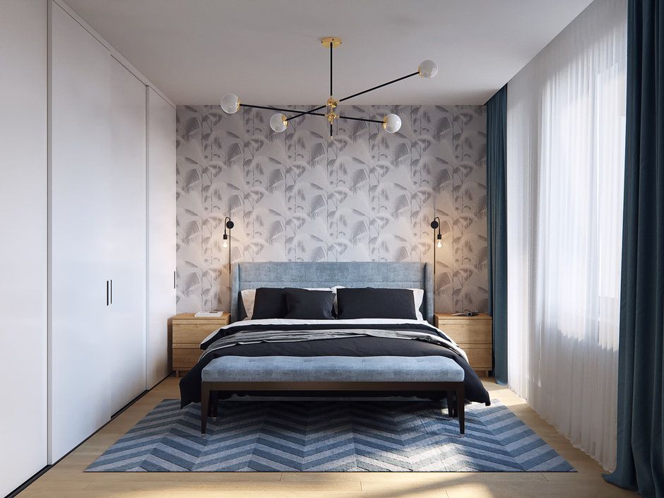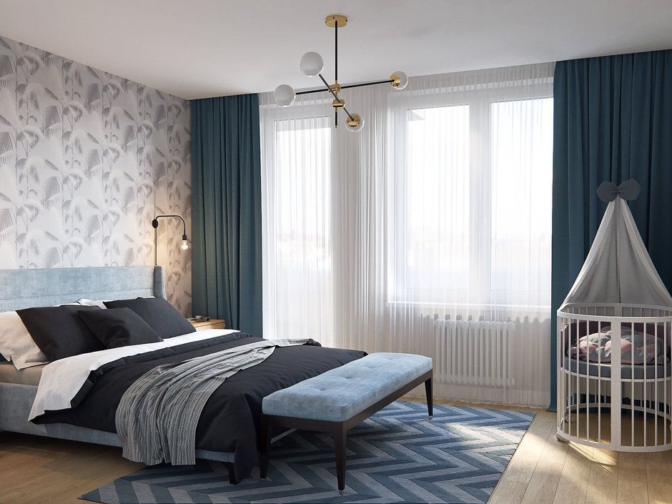 In dormitor, spatiul este tratat minimal. Zona de depozitare ocupa intreg peretele oferind spatii necesare pentru haine. Din fericire, dimensiunile camerei au permis o astfel de amenajare, ba chiar poate adaposti si un patut in cazul aparitiei unui bebelus. Designerul a ales sa puna in evidenta zona patului cu un tapet discret atat prin imprimeu, cat si culoare. Cromatic, predomina tonuri cuminti de albastru, subtil reluate la nivelul covorului, tabliei de pat si draperiilor.