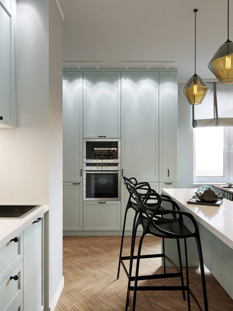 Dispunerea pe doua laturi ale incaperii a fost cheia rezolvarii amenajarii zonei de zi. De o parte avem zona de gatit si cea de spalat, iar de cealalta parte, restul electrocasnicelor, toate incorporate. Dulapurile superioare merg pana in tavan, optimizand astfel zonele de depozitare. In aceeasi masura au fost abordate si de cealalta parte.