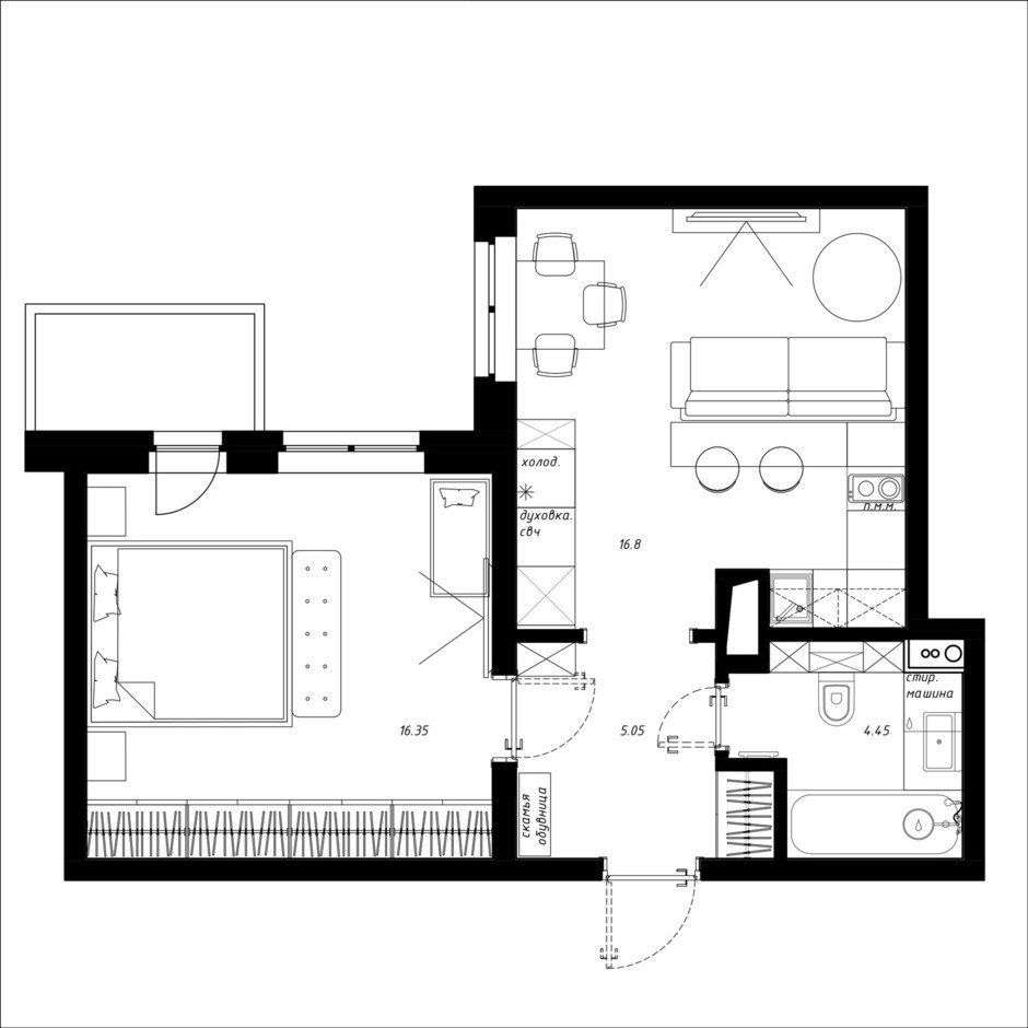Designerul a gandit astfel o camera multifunctionala. In cei 16 metri patrati gasim bucatarie, loc de luat masa, zona de bar si un living mic, cu o canapea si zona T V. Desi ar putea parea ingramadit, fiecare functiune in parte este bine pusa in valoare si cumva, delimitata vizual prin pozitionarea mobilierului. Dintre toate, bucataria este cel mai bine valorificata.