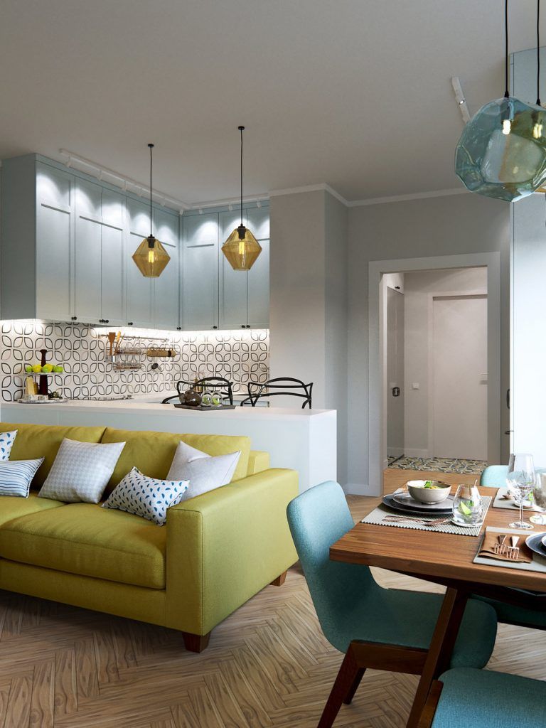 Pentru ca tot spatiul sa fie cat mai luminos, designerul a optat pentru culori deschise si accente de galben si albastru care imprima un plus de dinamica incaperii. Imprimeul jucaus al placilor din bucatarie impreuna cu aceste tuse colorate fac ca spatiul sa para mai vesel, mai primitor. Si iluminatul artificial isi are rolul determinant prin varietatea de corpuri integrate, accentul fiind pus inca o data pe zona bucatariei.