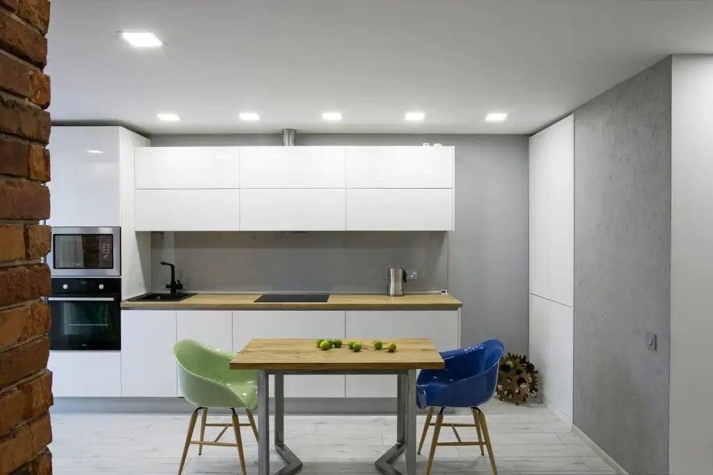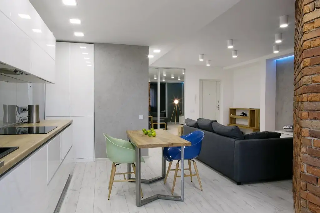 Pentru o eficientizare maxima se alege un mobilier in linii simple, in nuante deschise si lucioase. In cazul bucatariei si zonei de servire a mesei luminozitatea este punctul forte si asta datorita albului mural si cel al mobilierului, iluminatului artificial si materialului diafan al perdelei care permite patrunderea luminii naturale.