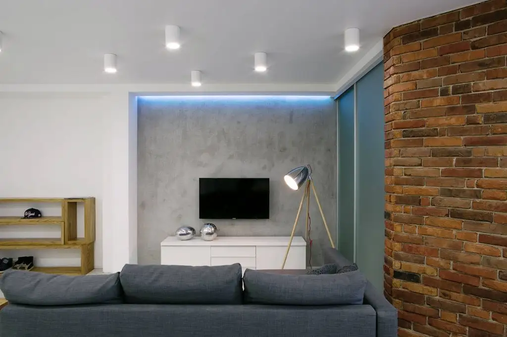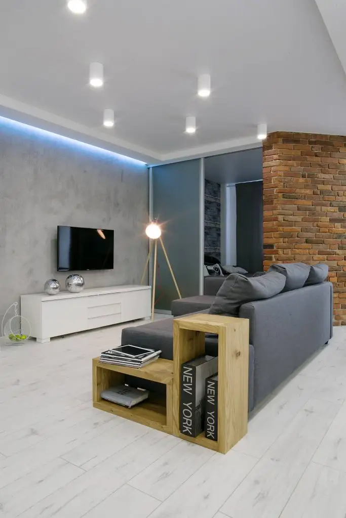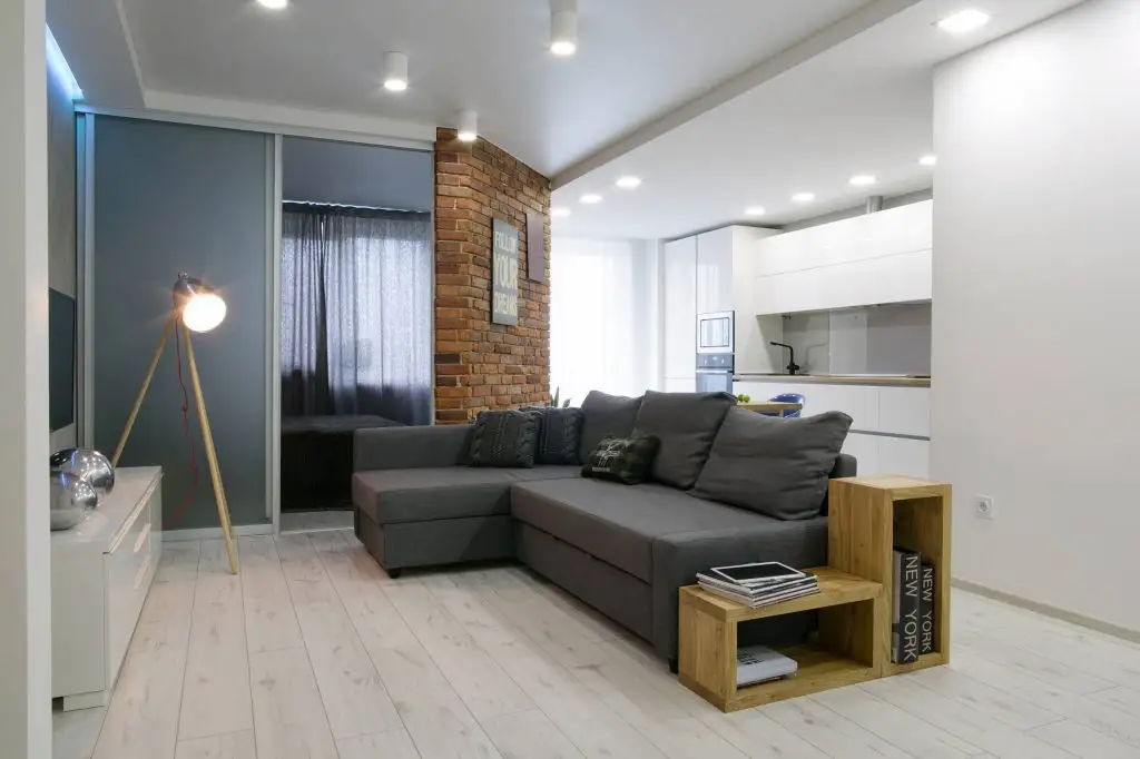 Un detaliu inedit al acestui open space il constituie peretele despartitor care face trecerea catre dormitor. Cele doua laturi usor hexagonale alatura doua planuri complet diferite din punct de vedere estetic: unul dintre pereti vine cu aspect de caramida, iar altul, se prezinta culisant si modern.