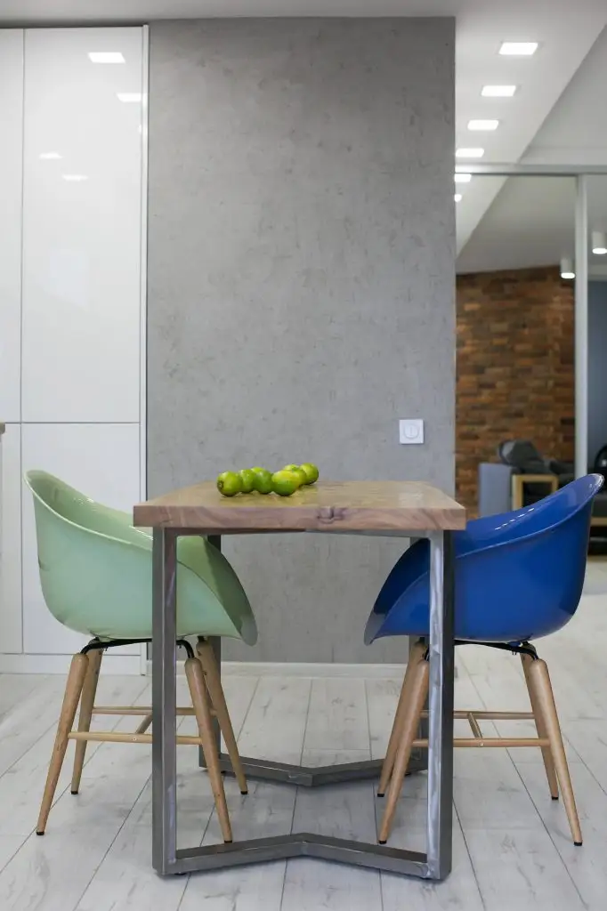 Accentele scandinave se reflecta in lemnul natural, plantele decorative si “petele de culoare” regasite cu precadere in designul abstract al celor doua scaune din zona de dining.