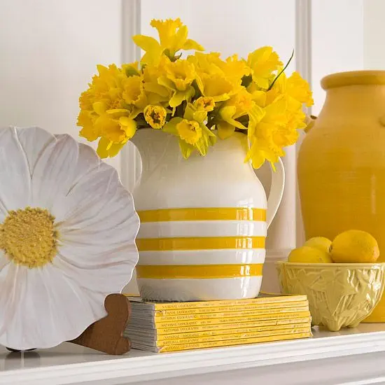 Plantele cu flori galbene, cum ar fi galbenelele sau narcisele, craitele si crizantemele, un cos cu fructe, un ghiveci galben, un suport de servetele sau chiar un abajur de lampa, iata doar cateva exemple usor de pus in practica.