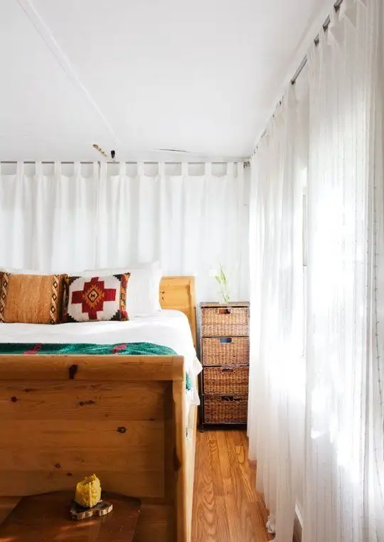 Pentru a crea o stare placuta de vacanta, accesorizeaza-ti dormitorul cu perdele vaporoase care permit aerului si luminii soarelui sa patrunda fara piedica prin ferestrele deschise. Materialele transparente cu un luciu discret au beneficiul de a redirectiona lumina naturala si imprastie o stralucire discreta in intregul dormitor.