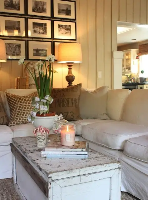 O masuta de cafea in stil shabby chic alaturi de o galerie din tablouri pentru un living cu accent romantic