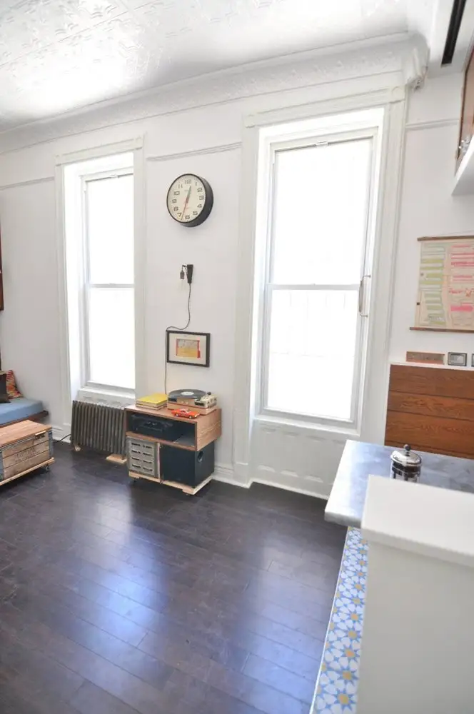 5. In ultima amenajare, decizia proprietarei de a elimina usa dintre camera de zi si zona de noapte, a ajutat-o sa castige luminozitate si o mai buna circulatie; tocurile fostelor usi au fost vopsite in alb pentru a le scoate frumos in evidenta si a arata o trecere intre spatii.