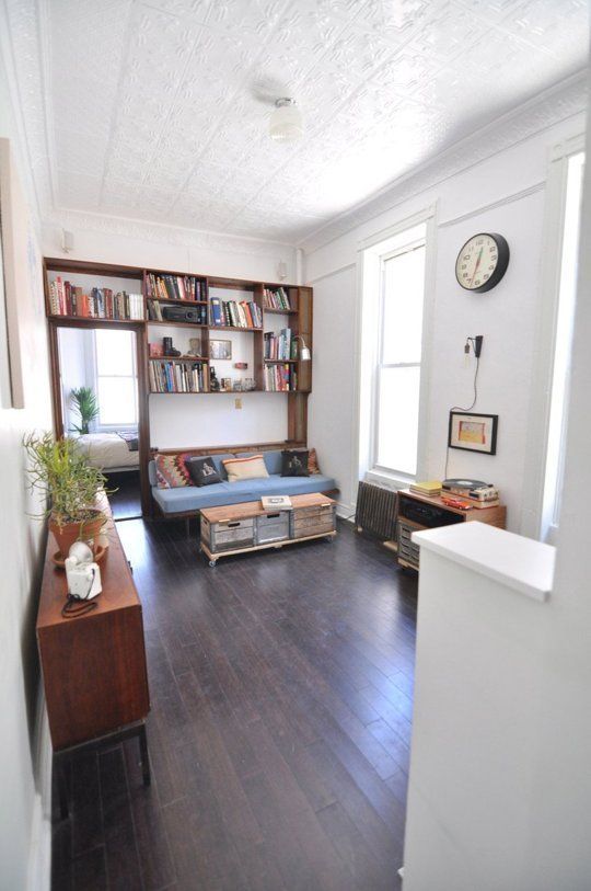 2. In al doilea caz, apartamentul este foarte mic, dar locuibil. Piesa de rezistenta este semineul si o sofa asezata la fereastra cu o priveliste minunata spre parc, compensand astfel pentru spatiul ingust.