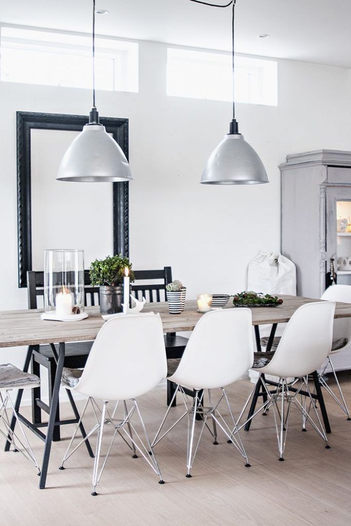 Masa din sufragerie moderna, cu un corp de iluminat supradimensionat