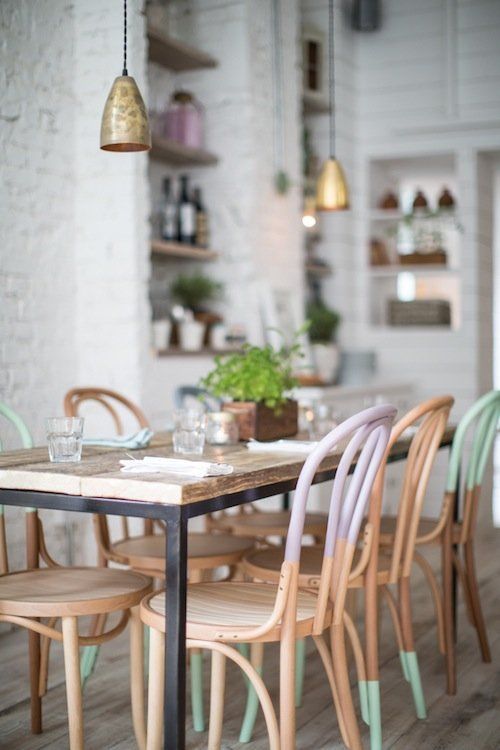 Masa din sufragerie pusa in valoare prin scaune vintage partial vopsite in culori pastelate