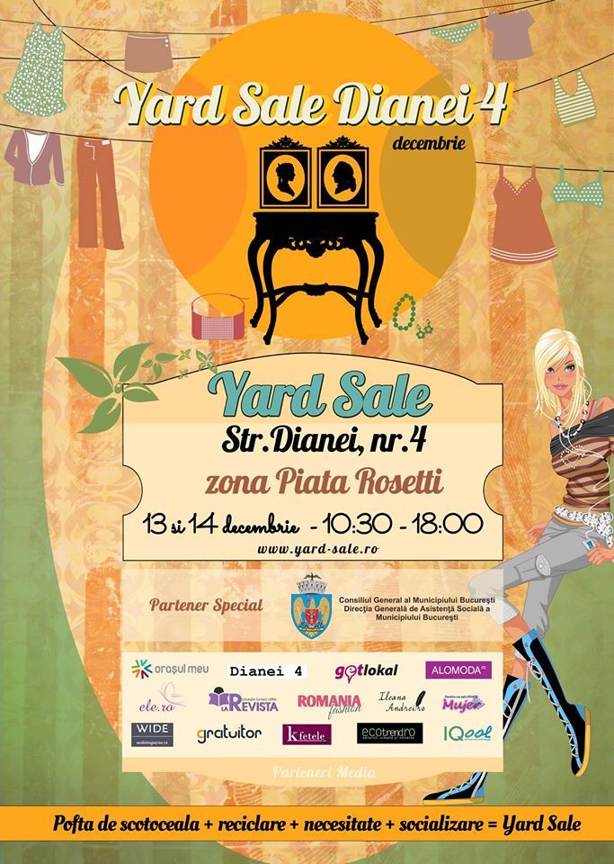 Pe 13, dar si pe 14 decembrie ne intalnim la cumparaturi cu buget redus la Dianei 4, unde de la 10:30 pana la 18:00, avem Yard Sale de decembrie. La etaj si demisol vor fi haine de toate felurile, incaltaminte, bijuterii, carti si obiecte deco ce isi cauta noi proprietari.