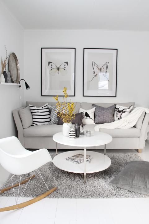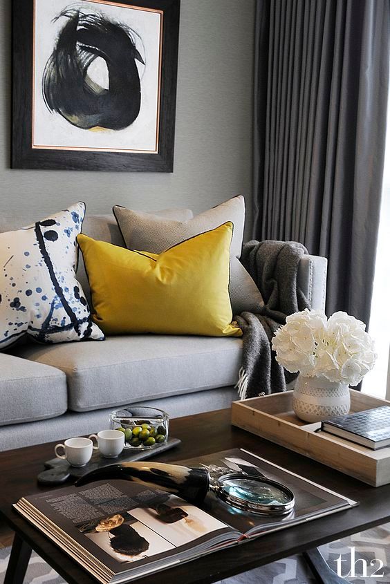 Tonuri de griuri si un detaliu cu galben! Foarte elegant acest living