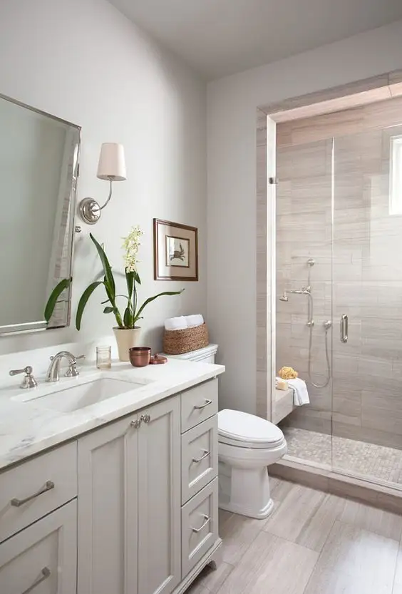 In privinta cromaticii bailor mici, noi pariem pe unitate atunci cand alegem nuantele pentru pardoseala si pereti. Acasta va asigura continuitatea cromatica a baii si o va face sa para mai spatioasa. Desi materialele sunt diferite in cazul podelei si a peretilor, trecerea dintre cele doua planuri nu trebuie sa se faca brusc.