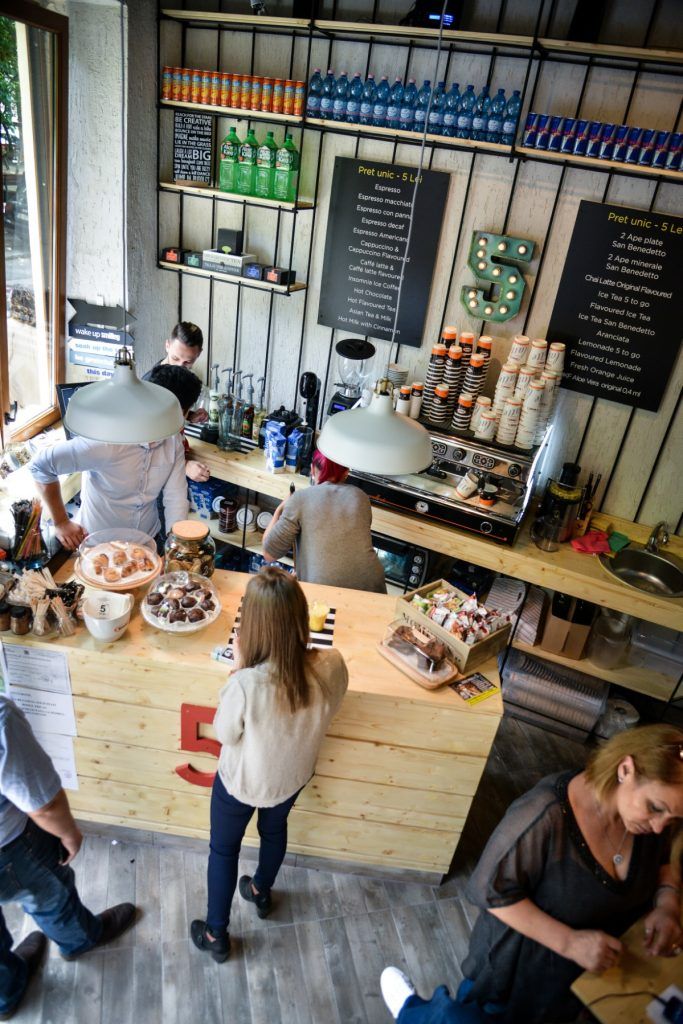 Coffee shop-ul din Piata Unirii are o suprafata de 20 de metri patrati, iar bugetul alocat lucrarilor a fost in jur de 15.000 de euro.
