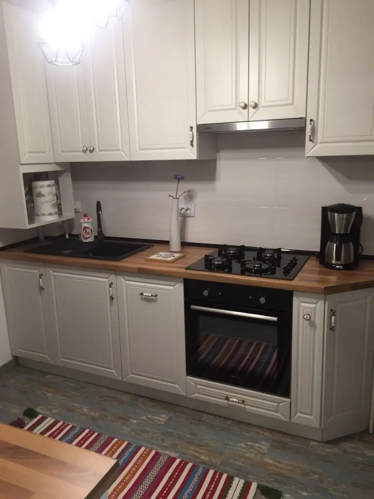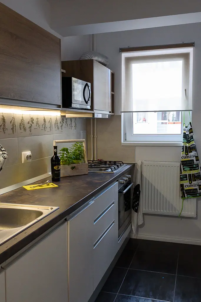 In amenajarea unei bucatarii mici de bloc opteaza pentru un mobilier realizat la comanda si pana in tavan pentru a utiliza la maximum fiecare centimetru patrat de care dispui.