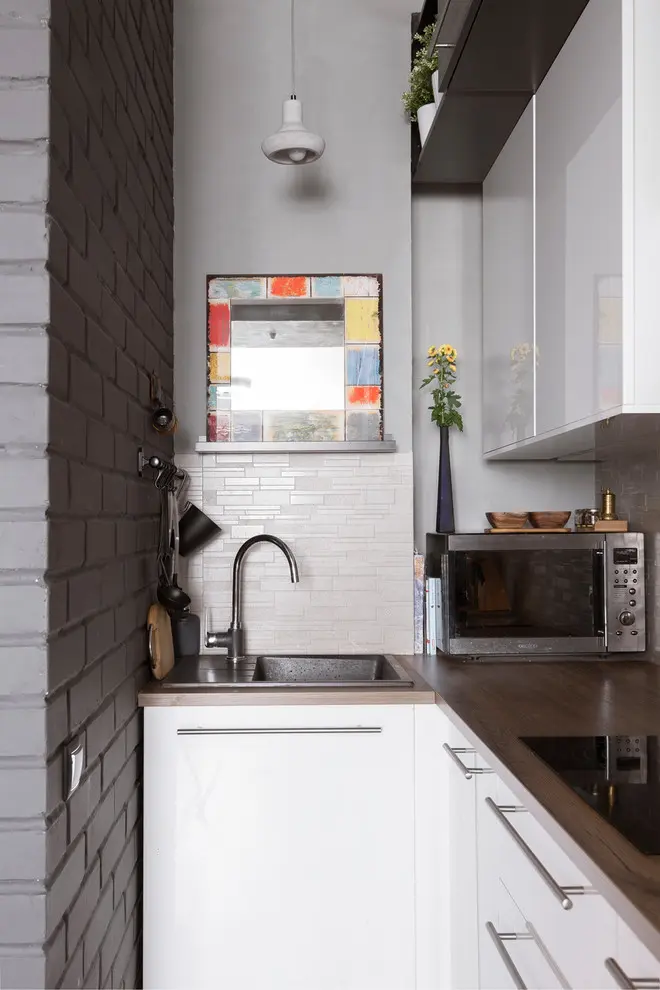 Cele mai multe idei de amenajare pentru bucatarii mici si inguste valorifica peretele cu fereastra, pentru ca e important ca incaperea sa fie luminoasa. In loc sa-l acoperi cu un corp suspendat de depozitare pentru ca simti nevoia sa creezi cat mai multe astfel de spatii, poti amplasa depozitarea sub pervaz.