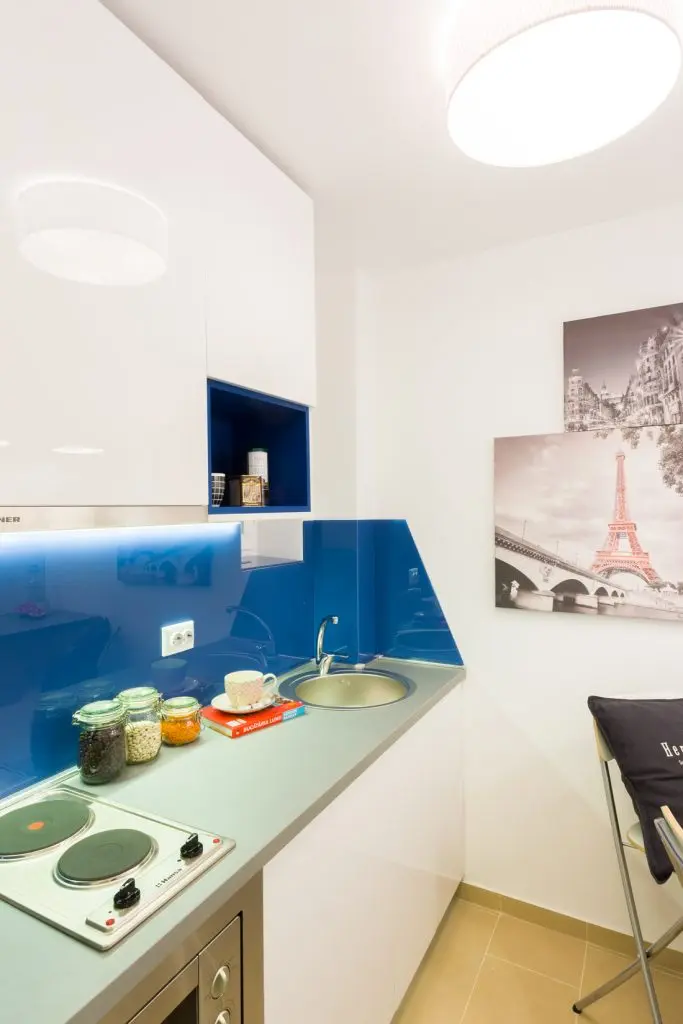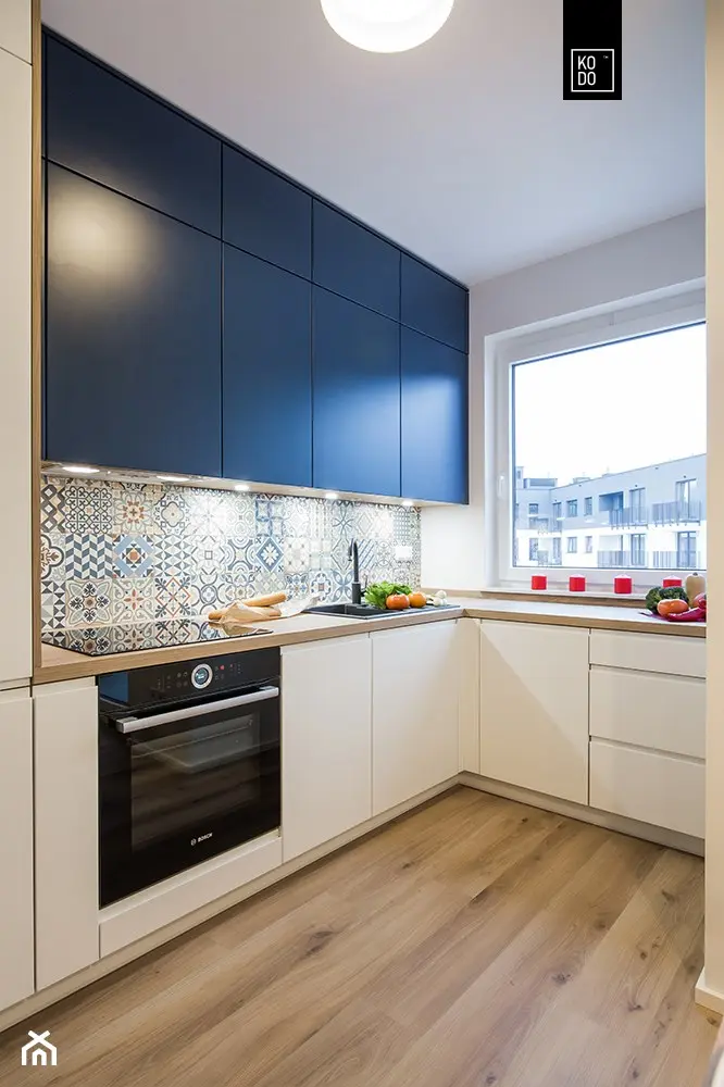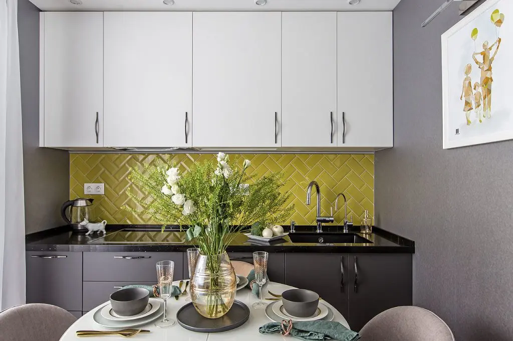 Mobilierul in forma de L te va ajuta sa economisesti spatiu si sa nu incarci peretii prea mult. Pastreaza blatul din bucatarie cat mai liber si nu inghesui prea multe recipiente sau decoratiuni. Daca vei pastra spatiul aerisit si organizat, vei observa ca nu vei mai fi atat de constient de dimensiunile mici ale spatiului.20