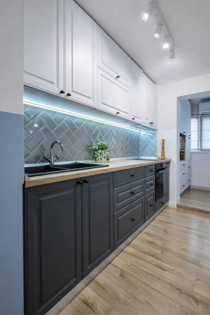 Lumina de accent va amplifica estetica unei bucatarii cu mobila pe doua laturi. Prin utilizarea unui con luminos in partea superioara a dulapurilor, plafonul va parea mai inalt si se va adauga un element de interes vizual deosebit. Lumina de accent va scoate in evidenta caracteristicile atractive ale bucatariei, pentru a estompa senzatia de spatiu ingust.
