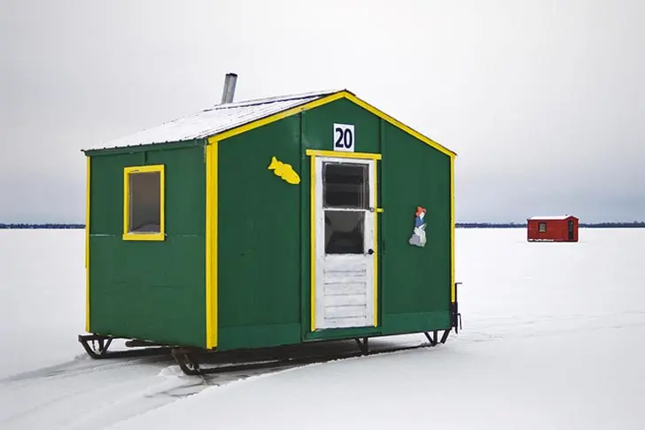 Cand ingheata Lacul Champlain din Quebec, in fiecare an, locuitorii acestor asezari isi imping cabanutele de pescuit pe mijlocul lacului si sunt lasate aici pe durata a 4-5 luni de zile.