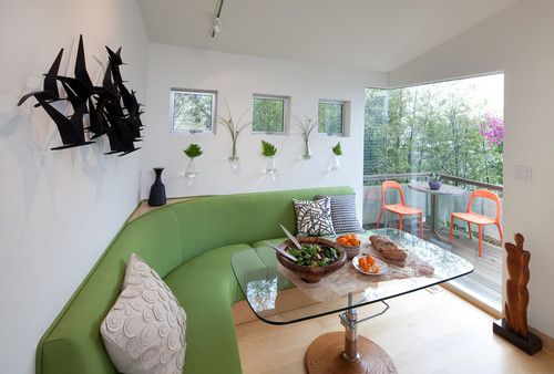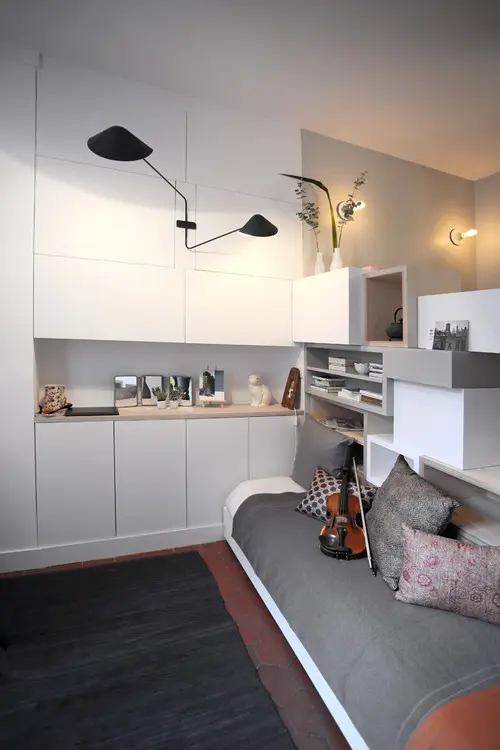 In spatiile foarte mici, in mod clar existenta unui pat este doar un deziderat. Cu o exceptie, insa. Designerii s-au gandit si la acest mic detaliu prin crearea unei suprafete ridicate cat ar fi necesar pentru introducerea unui pat. Aspectul interesant este ca noaptea, patul se trage si este folosit ca atare, iar pe timp de zi, este utilizat pe post de canapea (vezi foto galerie). Adaugand si cateva perne decorative, nimeni nu va banui in ce se transforma de fapt canapeaua. Se pot adauga dulapuri si rafturi cu diverse functii pentru a crea un spatiu bine organizat.