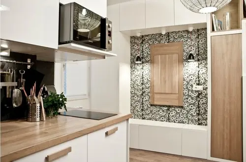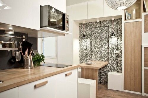 Bucatariile mici ne dau batai de cap cand vine vorba de amenajarea lor. Prea multe lucruri, intr-un spatiu mult prea ingust ca sa mai putem aseza si o masa. Iata doua variante foarte utile: o masa extensibila care se trage, la propriu, din interiorul blatului sau al unui sertar si varianta unei mese rabatabile care se strange la perete cand nu este folosita. In plus, daca se creeaza o nisa, sub ea vor putea fi asezate scaune sub forma unor cuburi.