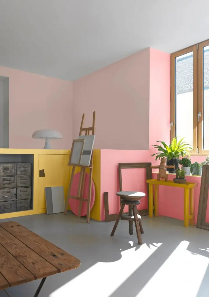 Tonic si prietenos, galbenul in nuanta apusului de soare stimuleaza atmosfera, in timp ce rozul pal indulceste decorul camerei. Dispuse pe partile laterale ale celor doi pereti adiacenti, cele doua culori creaza un foarte interesant joc de perspective.