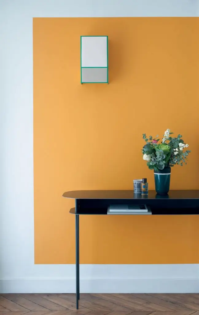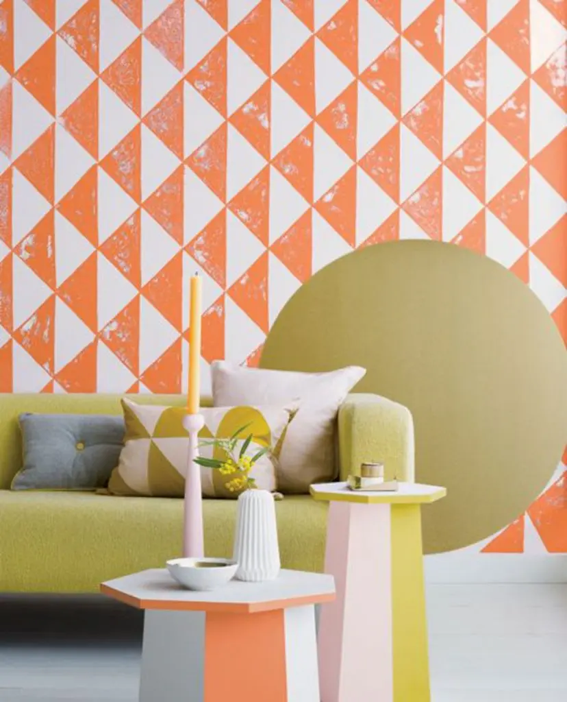 Portocaliul intr-o nuanta citrica, vibranta, se combina de minune cu decorul simplu, in patternuri geometrice. Asocierea cu albul impecabil si triunghiurile jucause creaza un perete pregatit pentru a aduce atmosfera de vara printr-un aspect perfect aliniat cu tendintele acestui anotimp.