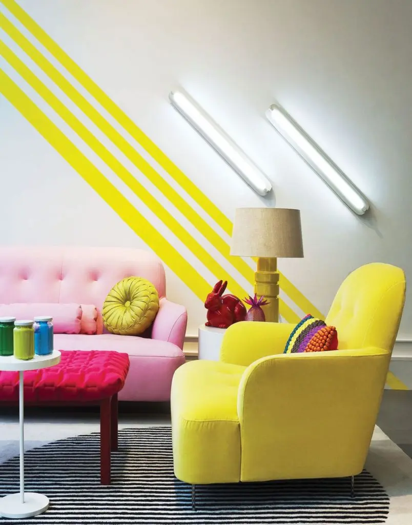 Pentru a realiza efectul de raze de soare pe peretii livingului tau, aplica cateva dungi intr-o nuanta galben-lamai, insa ai grija sa o faci cu moderatie. O astfel de nuanta nu va arata bine pe o sectiune ampla din perete, insa va impresiona daca o aplici pe mici suprafete plane sau in cateva dungi colorate.