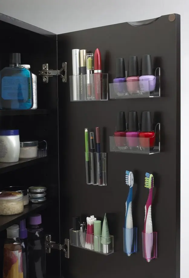 Se foloseste partea interioara a usilor de la dulap pentru a aranja cele necesare si a le etala in voie. Se agata sau se lipesc suporturi de preferat de plastic astfel incat greutatea sa nu fie foarte mare si sa fie sustinuta de balamalele dulapurilor. Solutia ajuta la organizarea fardurilor, obiectelor de styling, aparatelor pentru coafarea parului si chiar si a produselor de curatat.