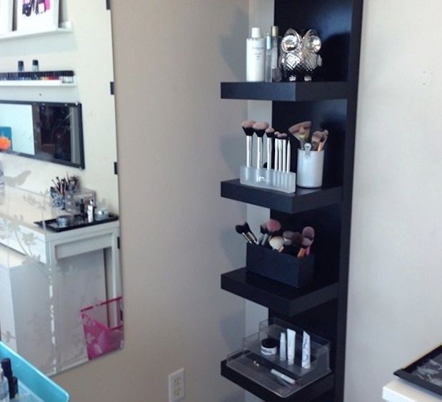 Toate cosmeticele adunate in 3 suporturi fixate in perete.