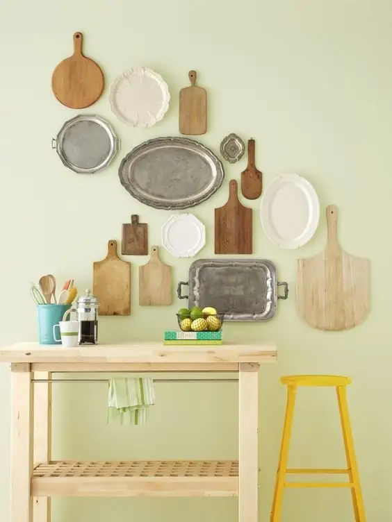 Expozitie cu tavi si tocatoare pentru un perete din bucatarie