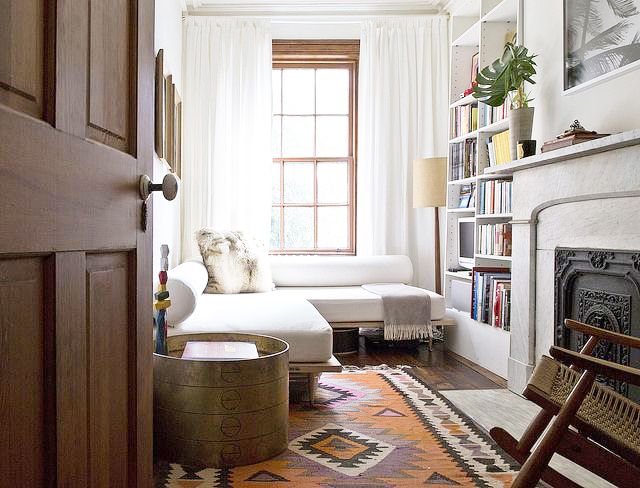 Decorul anost. O locuinta mica nu inseamna o limitare din punct de vedere al optiunilor privind decorul. Asadar poti aduce o nota aparte spatiului prin incorporarea unor modele cu accente luminoase sau in culori indraznete. In camera din imagine draperiile colorate lipite de tavan distrag atentia si il fac pe privitor sa uite ca incaparea este atat de mica, punctul de interes fiind modelul atragator al panzei.