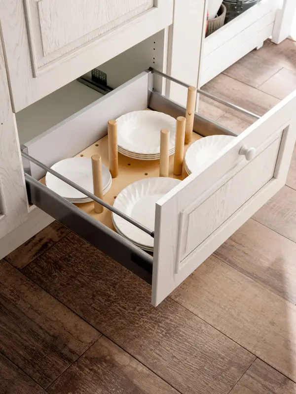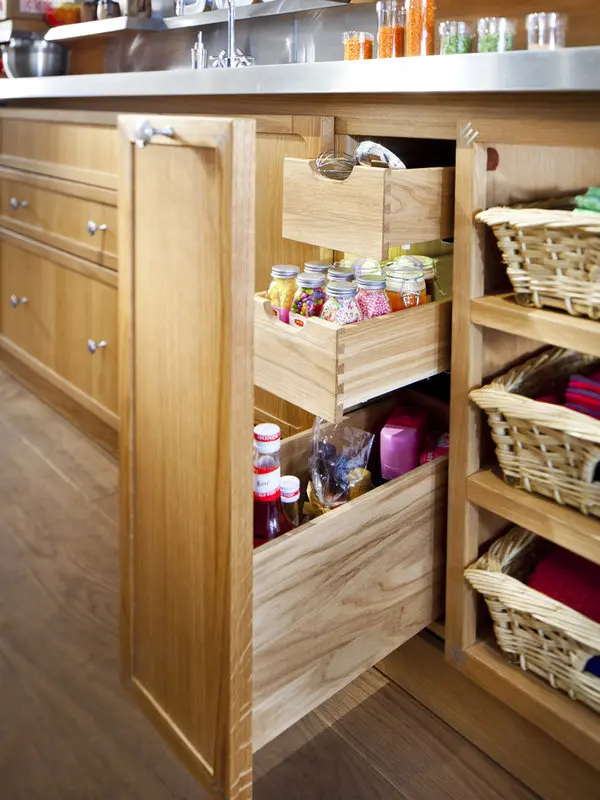 Organizeaza sertarele si interioarele dulapurilor. Astfel, in loc sa instalezi cuptorul sub plita, il poti pune la un nivel la care il poti accesa mai usor, iar in locul lui sa asezi diferite sertare cu adancimi variate. Aici poti ordona ustensilele, tacamurile, oalele si tigaile pentru a le avea la indemana atunci cand gatesti.