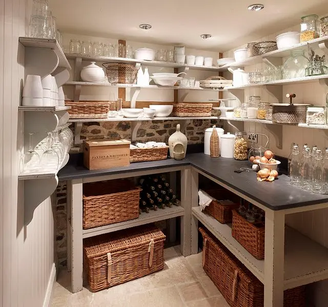 Tine cont si de organizarea din camara! Foloseste polite si cosuri de diferite forme si marimi pentru fructe si legume, condimente, paste, sosuri si gemuri.
