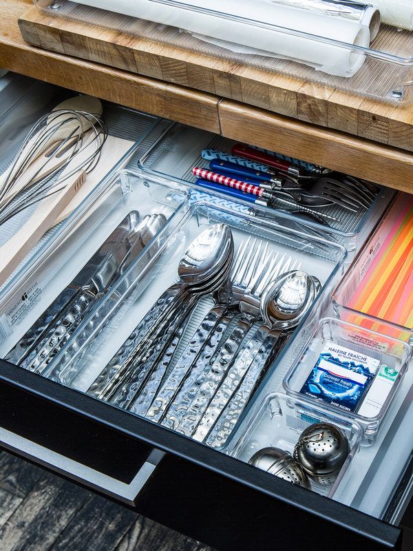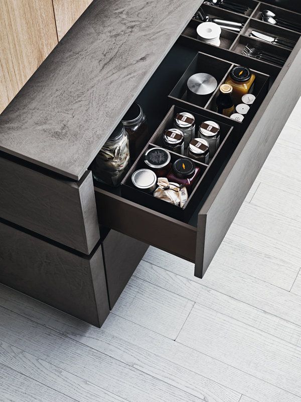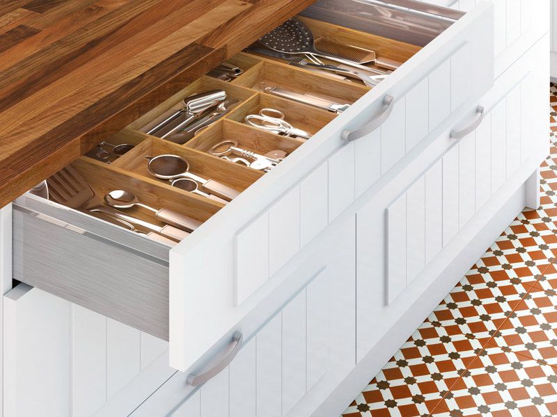 Organizeaza sertarele si interioarele dulapurilor. Astfel, in loc sa instalezi cuptorul sub plita, il poti pune la un nivel la care il poti accesa mai usor, iar in locul lui sa asezi diferite sertare cu adancimi variate. Aici poti ordona ustensilele, tacamurile, oalele si tigaile pentru a le avea la indemana atunci cand gatesti.