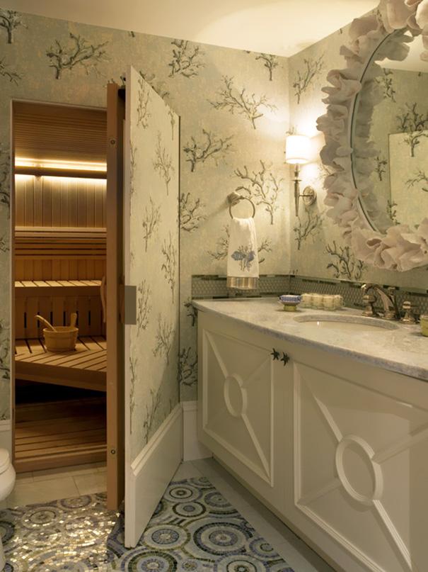 O usa camuflata in ton cu designul tapetului din baie, care sa conduca spre o sauna. Nu e genial?