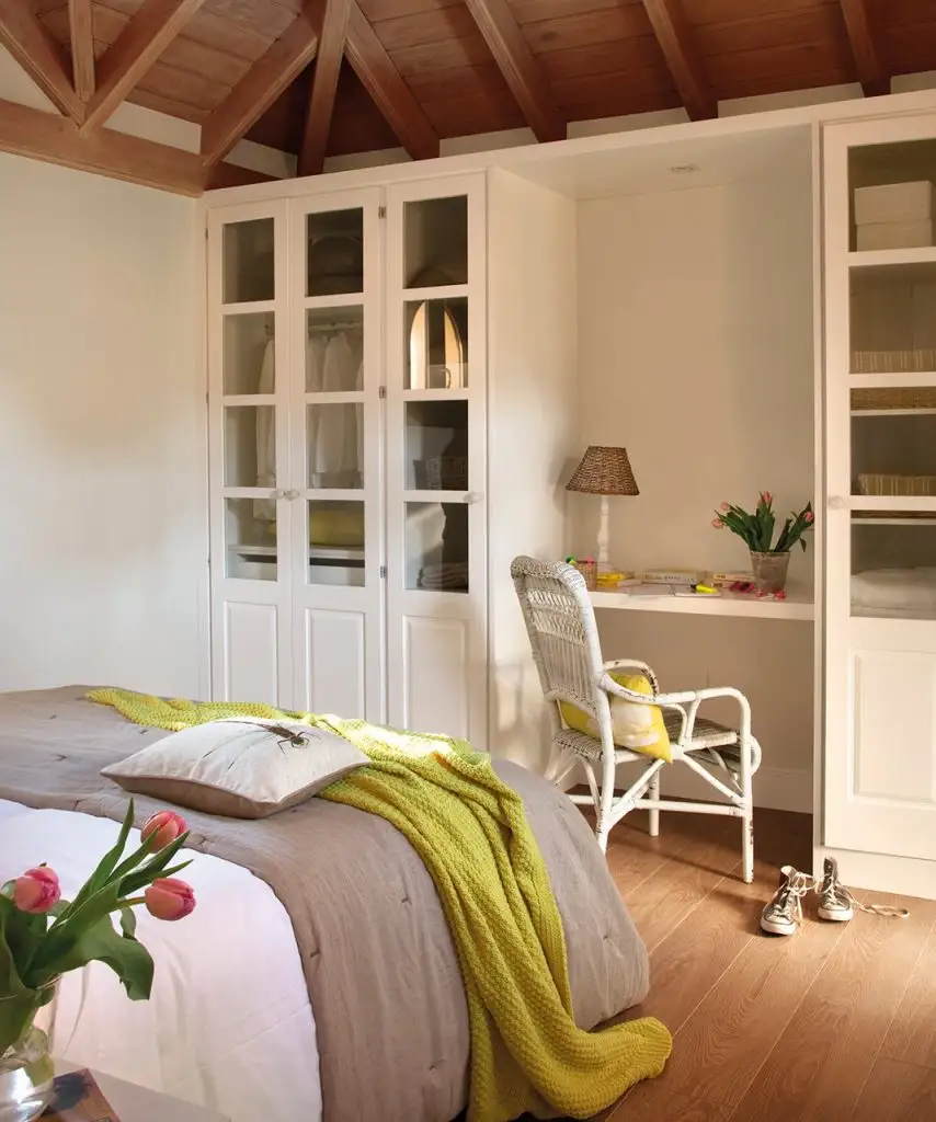 Cand nu ai suficient spatiu pentru un birou in cadrul livingului, atunci instaleaza-l in dormitor. Unde? Intre 2 dulapuri. Un blat de 80 cm lungime si 40 cm latime, un scaun comod, si iata un mic birou chic pentru tine.