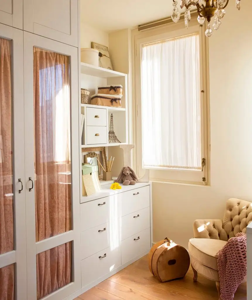 Intr-o camera mica sau lunga si ingusta, te poti folosi de spatiul din jurul ferestrei pentru a crea mai multe zone de depozitare (precum in amenajarea din galerie). O polita lunga fix deasupra ferestrei si apoi un blat cu masca pentru calorifer integrata si sertare pentru depozitare.
