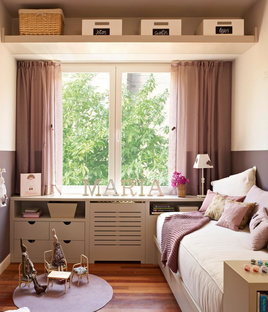 Intr-o camera mica sau lunga si ingusta, te poti folosi de spatiul din jurul ferestrei pentru a crea mai multe zone de depozitare (precum in amenajarea din galerie). O polita lunga fix deasupra ferestrei si apoi un blat cu masca pentru calorifer integrata si sertare pentru depozitare.
