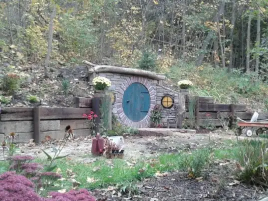 Casa Hobbit se afla intr-o frumoasa gradina, in care proprietarii si-au dorit putina poveste. Astfel, au construit un zid ca o intrare in casa Hobbit. Seamana atat de bine incat iti vine sa te duci sa vezi daca Frodo este acasa.
