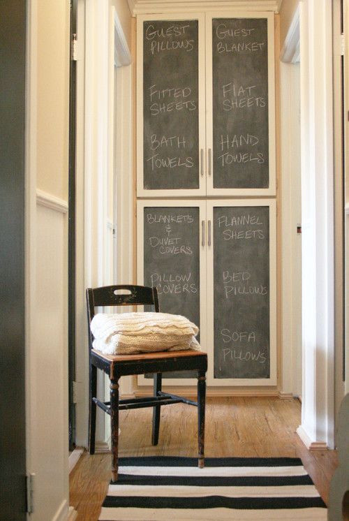 O idee practica este un dulap cu usi vopsite in vopsea de tabla scolara pe care sa scrii in dreptul fiecarui obiect din interior.