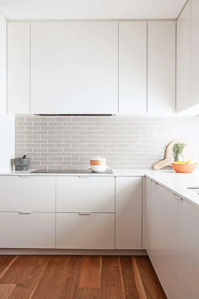 Daca spatiul din bucatarie nu este foarte generos, poti optimiza depozitarea optand pentru dulapuri pana in tavan (preferabil cu un front alb), ca in acest model de amenajare