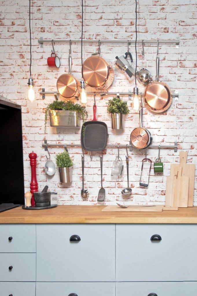 Amenajare cu influente industriale ustensile si cratite expuse pe un perete ( aici de caramida aparenta)