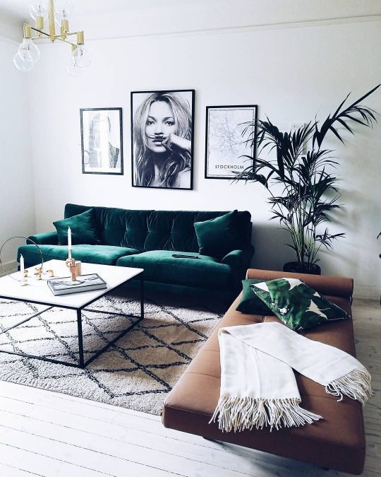 Catifea verde smarald si canapeaua este piesa de rezistenta a acestui living