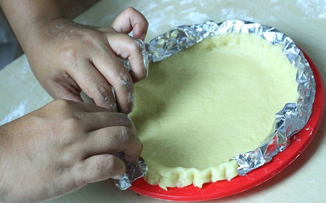 Protejeaza crusta de la placinta de mere astfel: acopera marginile aluatului cu folia de aluminiu