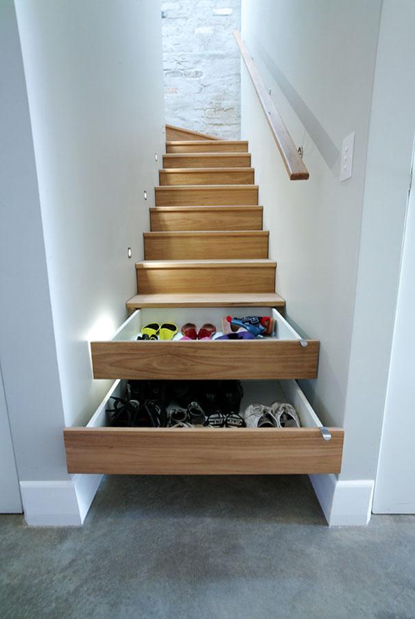Poti realiza sertare pentru papuci, chiar din treptele ce duc la mansarda