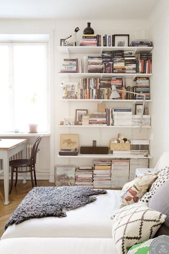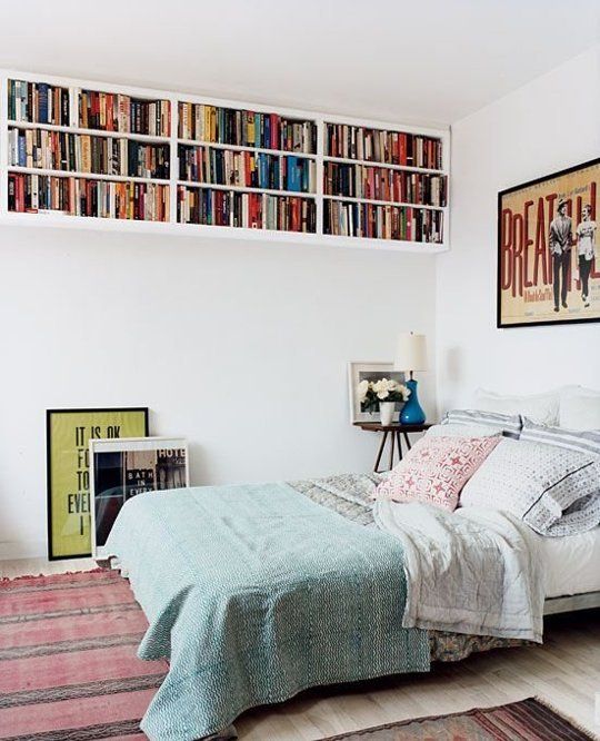 Nu mai ai loc si pentru noptiere langa patul tau? Agata mai multe rafturi pe perete si organizeaza-ti o biblioteca foarte accesibila chiar desupra patului. Poti avea la indemana cartile preferate chiar si intr-un dormitor ingust.