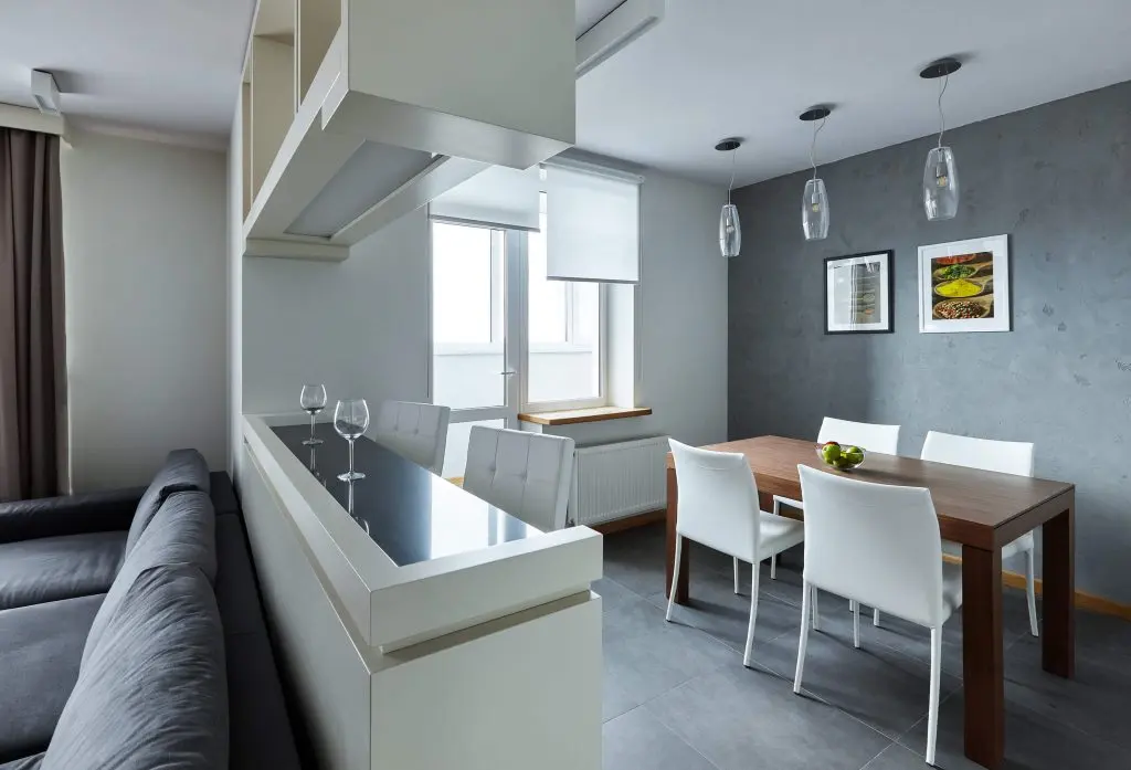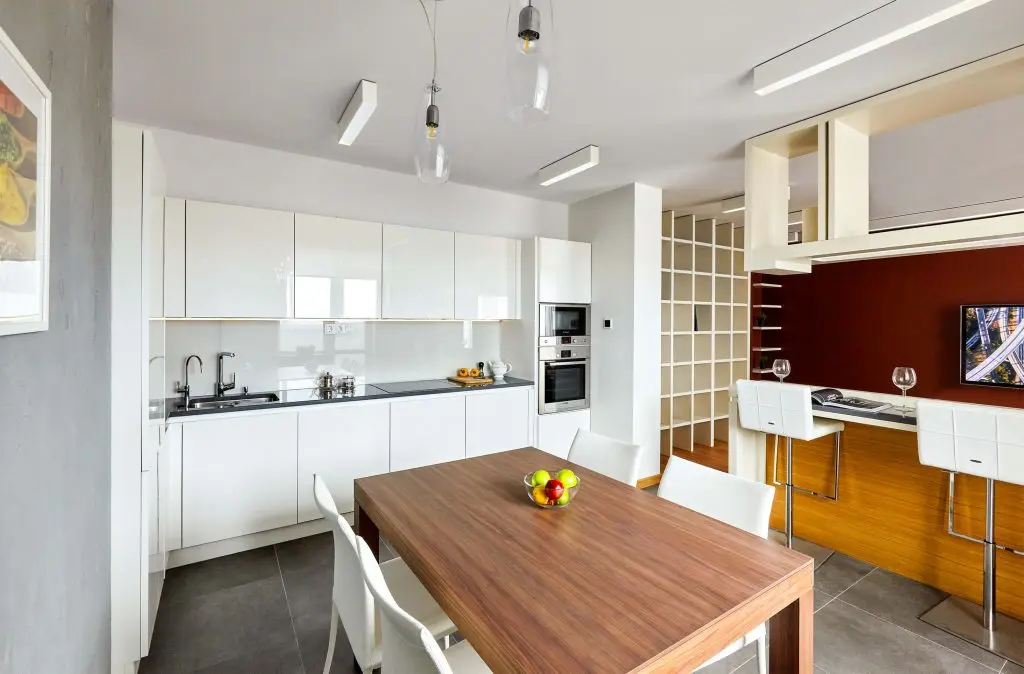 Bucataria se deschide catre living prin zona barului si include un spatiu generos pentru luat masa decorat cu trei corpuri de iluminat suspendate din sticla. In aceasta zona de zi dispunerea mobilierului si a decoratiunilor ne duce cu gandul la modul in care este organizata o garsoniera.