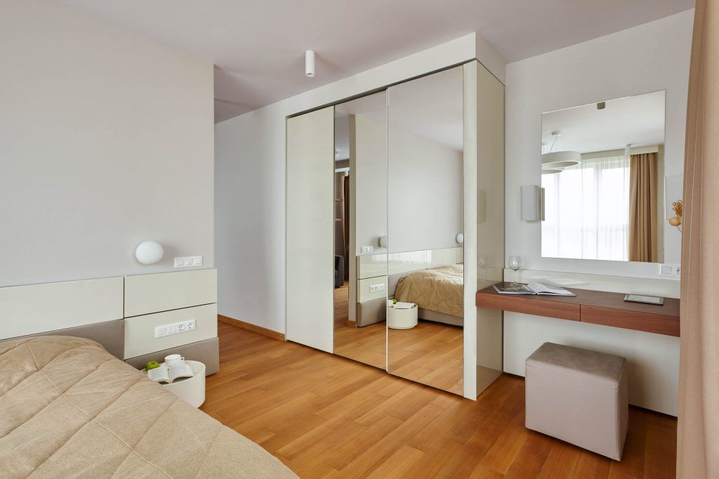 Mobilierul lucios impreuna cu oglinzile si abundenta albului creeaza senzatia unui dormitor foarte generos ca spatiu.