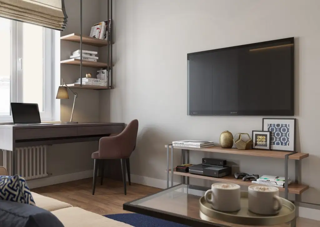 Cel de-al doilea dormitor este destinat musafirilor, dar si unei zone de lucru (vezi biroul amenajat la fereastra), precum si unui spatiu destinat jocurilor. Este o camera multifunctionala, bine gandita pentru nevoile cuplului. Dulapurile de jur imprejurul canapelei extensibile ofera un plus de spatiu pentru depozitare.
